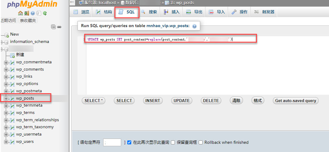 登陆网站宝塔后台,打开数据库管理,找到找到 wp_posts 表,在点击 SQL ,然后执行批量替换语句: