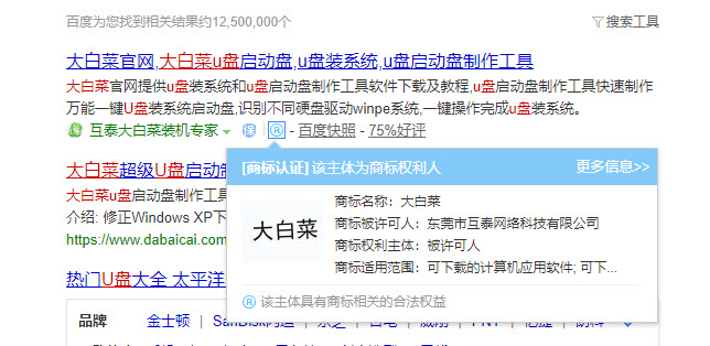 「东莞市互泰网络科技有限公司」所有的Winbaicai和dabaicai,拥有大白菜商标,而且建立较早,其他产品如电脑店官网(diannaodian.com)、老毛桃官网(laomaotao.com)域名也更正式。