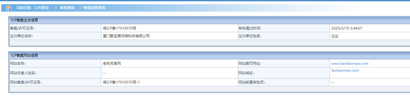 查询老挑毛(laotiaomao.com)的备案资料可以知道主办单位为「厦门聚宝商网络科技有限公司」。