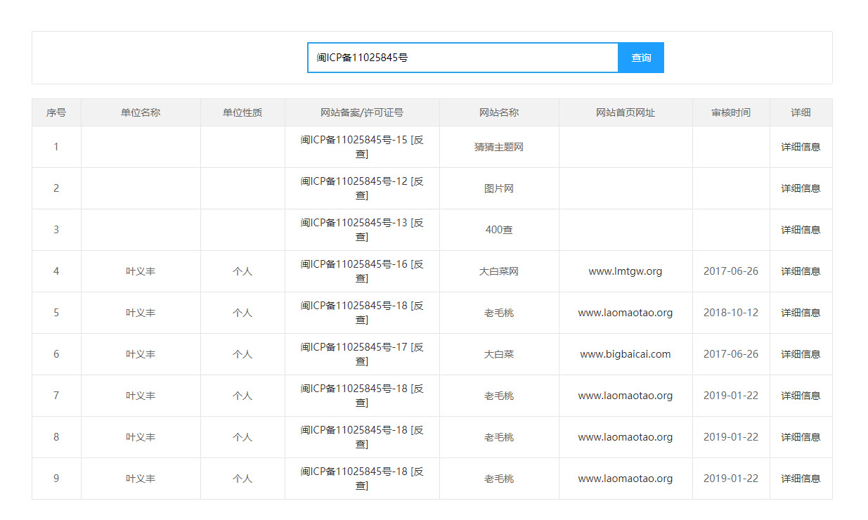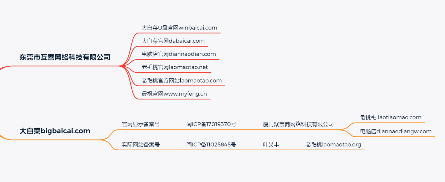 靠着淘宝店的那个老毛桃(laomaotao.org)信息去搜索,在官网找到备案号闽ICP备11025845号,通过这个备案号可以知道是由个人叶义丰拥有,而且也发现了大白菜(Bigbaicai.com)实际备案人也是他。