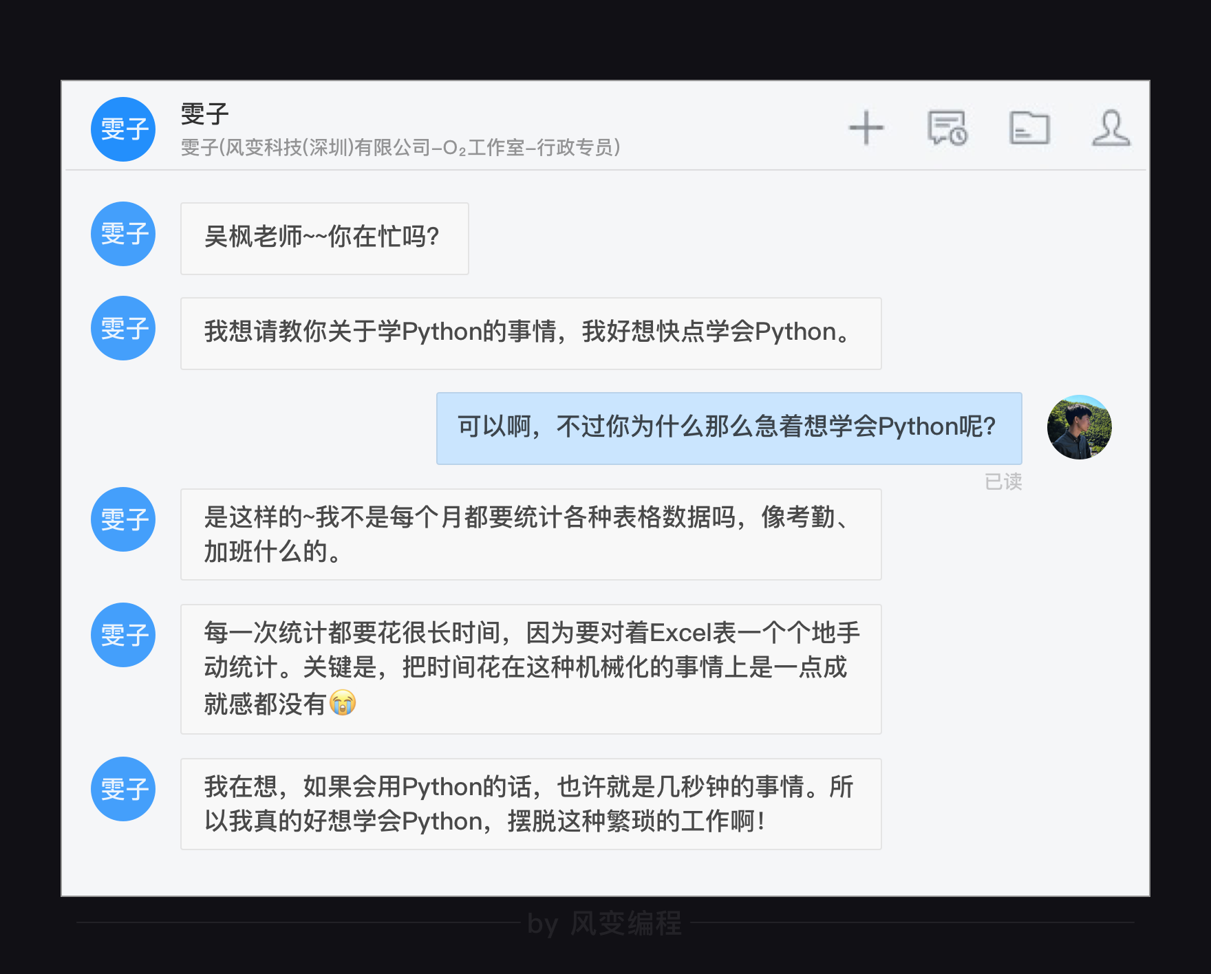 说到这,就不得不提到最近在我身边发生的一件事儿:前阵子,公司的行政小姐姐来请教我关于Python学习的问题。