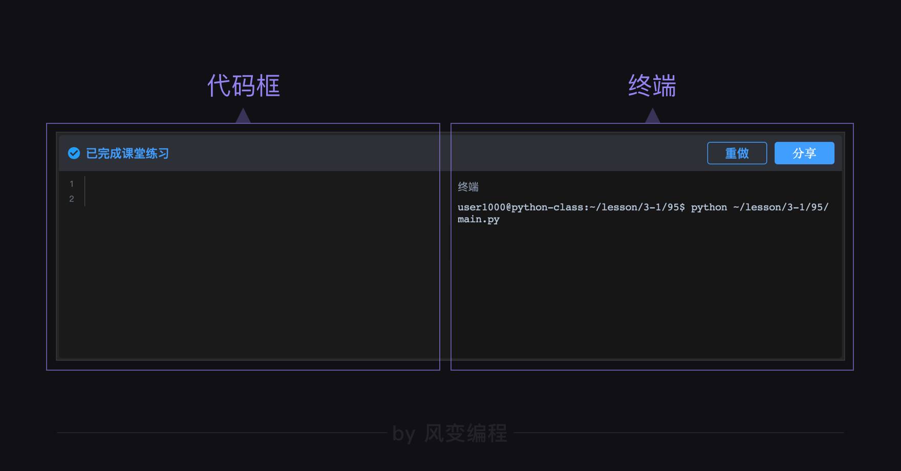 接下来我们经常会用到代码框和终端这两个词作为课堂练习的提醒,可不要把它们搞混了。