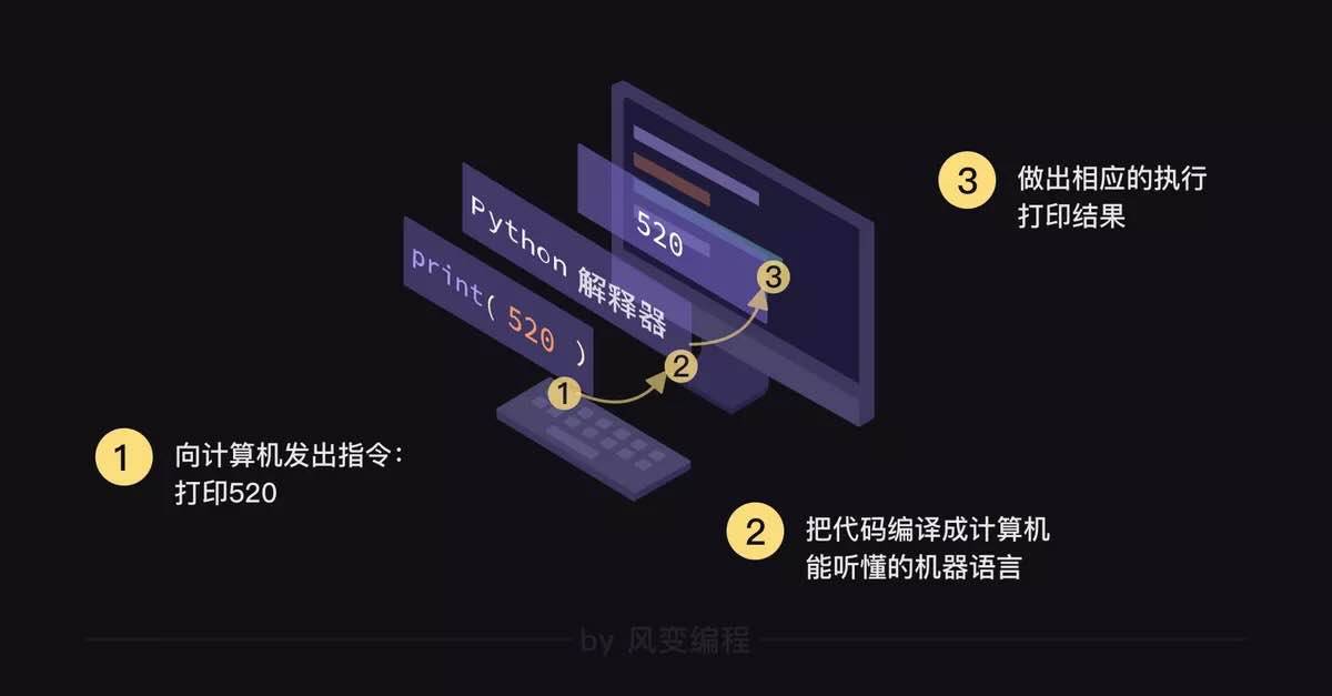 (0)我们向计算机发出指令:“打印‘520’”;(1)Python把这行代码编译成计算机能听懂的机器语言;(2)计算机做出相应的执行;(3)最后把打印结果呈现在我们面前。