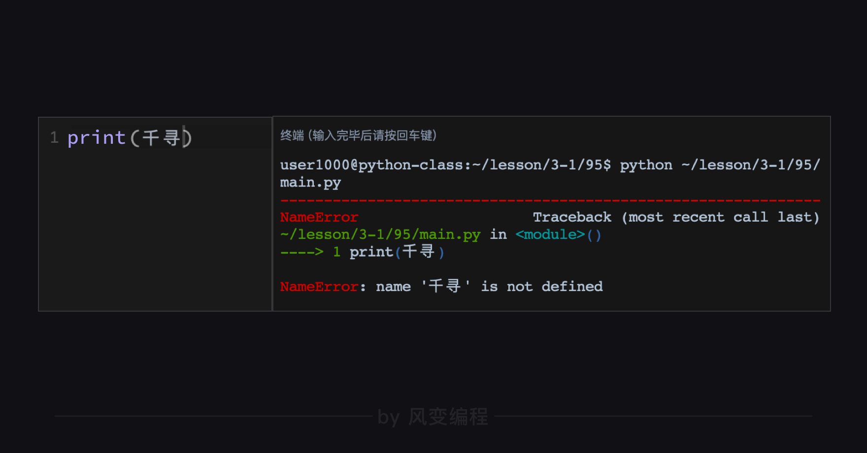 如果你直接让计算机print(千寻),它会一脸懵并大声报错:“这两个字啥意思,你没有定义清楚,不懂诶……”