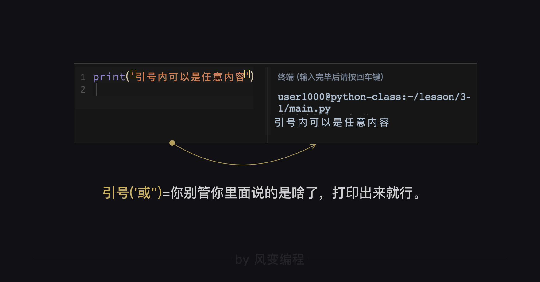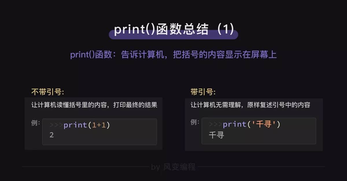 这,便是print()函数中引号的用法:当括号内有引号的时候,就相当于告诉计算机——你不需要执行多余的操作,我输入什么,你就打印什么。