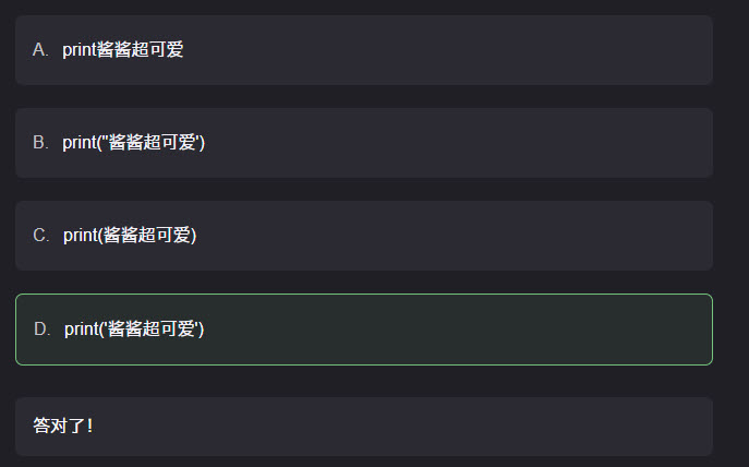 答对了!A选项漏了括号和引号;B选项用了不同的引号,会报错;C选项漏了引号。