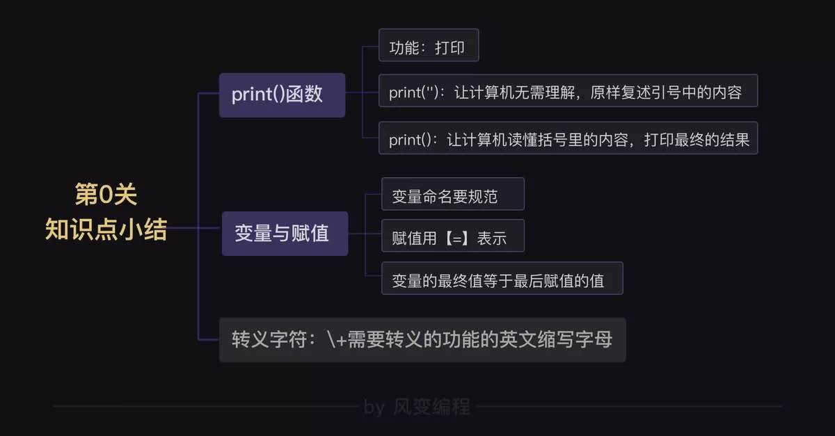 在上一关,我们已经推开了Python世界的大门,通过Python中最基本的print()函数,开启了我们第一声问候。现在,我们先回顾下上一关的知识点。