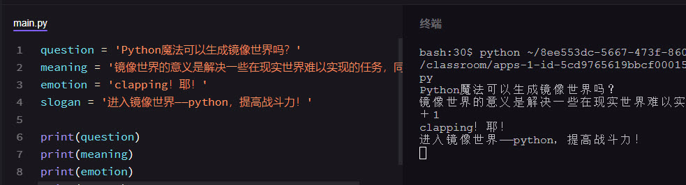 bash:28$ python ~/8ee553dc-5667-473f-8602-60e953e18473/classroom/apps-1-id-5cd9765619bbcf0001554798/28/main.py Python魔法可以生成镜像世界吗? 镜像世界的意义是解决一些在现实世界难以实现的任务,同意+1 clapping!耶! 进入镜像世界——python,提高战斗力!
