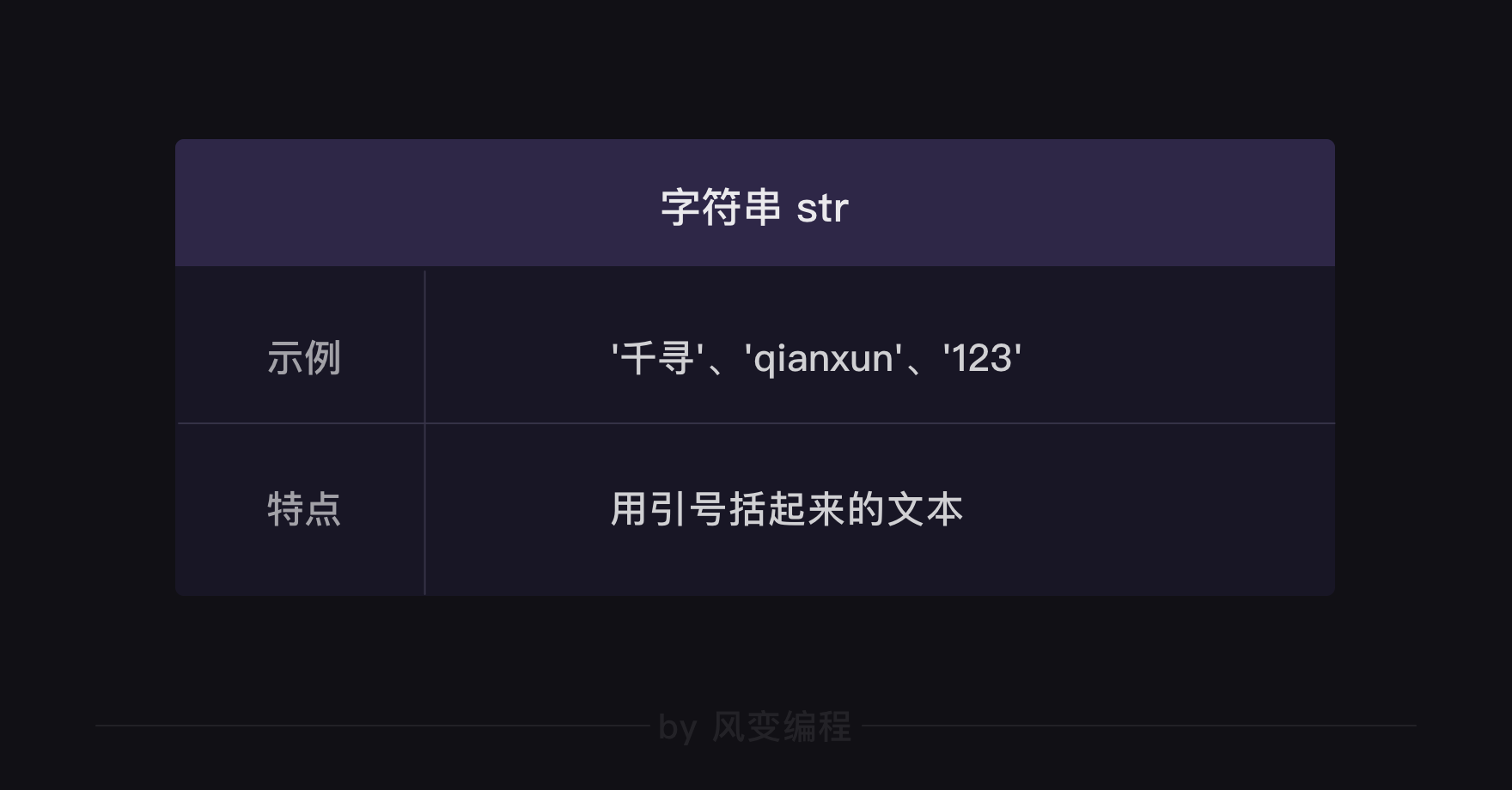 字符串的识别方式非常简单——有层名为【引号】的皮,只要是被【单/双/三引号】这层皮括起来的内容,不论那个内容是中文、英文、数字甚至火星文。只要是被括起来的,就表示是字符串类型。