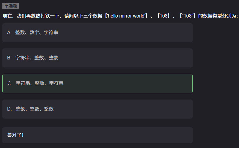 答对了!由单引号括起来的【'hello mirror world'】和【''108''】是字符串,无引号的【108】是整数。