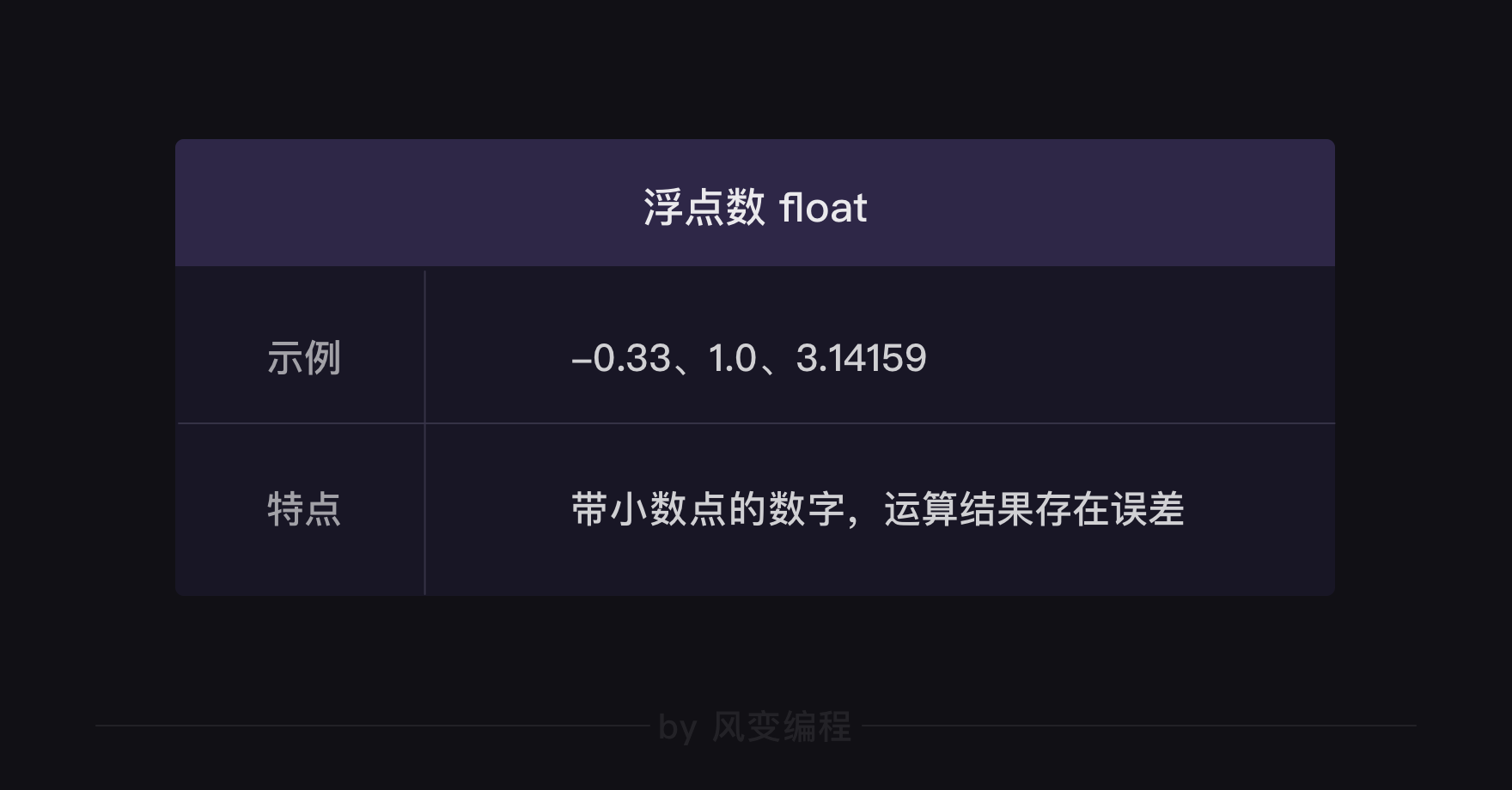 浮点数的英文名是float,与整数(int)和字符串(str)不同,浮点数没有简写。