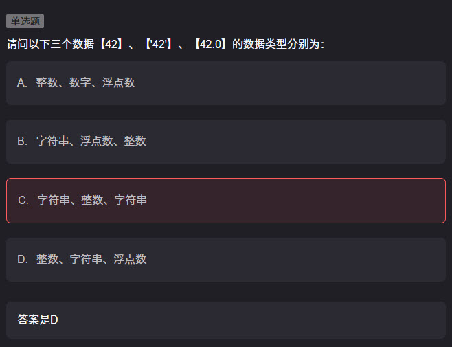 答案是D。一眼看上去它们三个好像是同样的东西,但它们属于完全不同的数据类型。42是整数,由单引号扩起来的'42'是字符串,有小数点的42.0是浮点数。