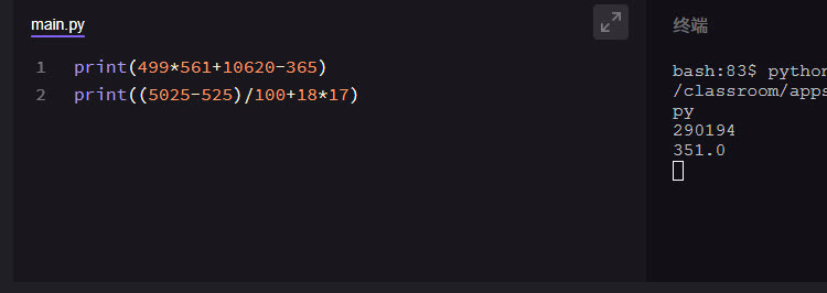 我们来看看【print((5025-525)/100+18*17)】的运算顺序:最先计算括号里的【5025-525】。