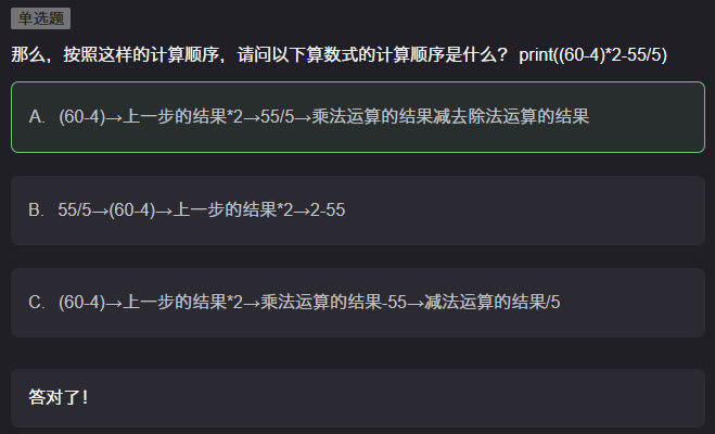答对了。按照运算优先级口诀,从左到右先算括号里的,括号外的则乘除先于加减。