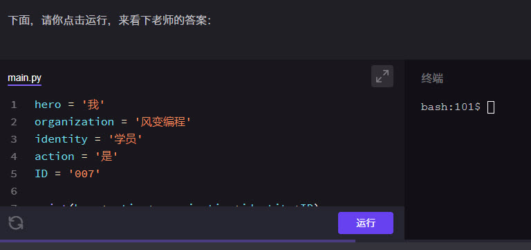 hero = '我' organization = '风变编程' identity = '学员' action = '是' ID = '007' # 输出结果 我是风变编程学员007