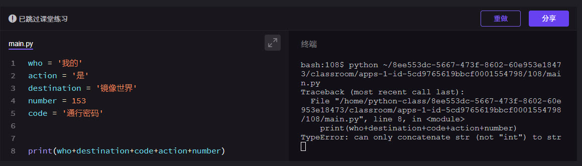 梦想是美好的,但现实是残酷的,我们立马被报错【TypeError:can only concatenate str (not "int") to str】(类型错误:只能将字符串与字符串拼接)无尽地呻吟。