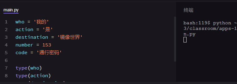 who = '我的' action = '是' destination = '镜像世界' number = 153 code = '通行密码' print(who+destination+code+action+str(number))