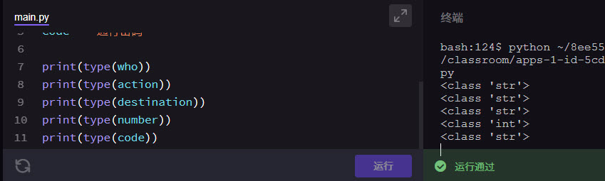 只要你把内容写在括号里,type()函数就会立即将它的类型查询出来。下面,请你用刚才的代码来试一下。请直接点击运行按钮,只要运行通过就请继续课程。