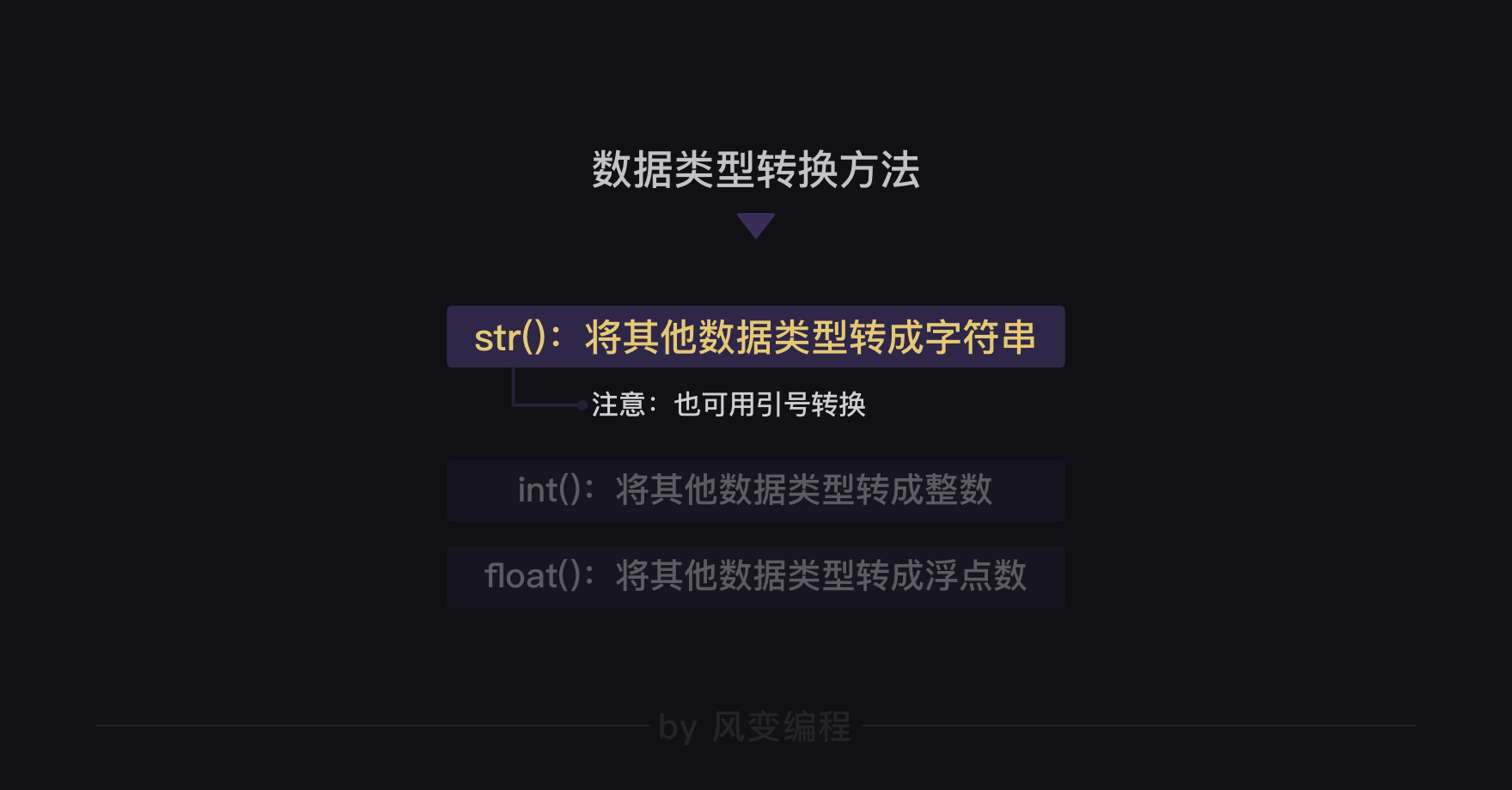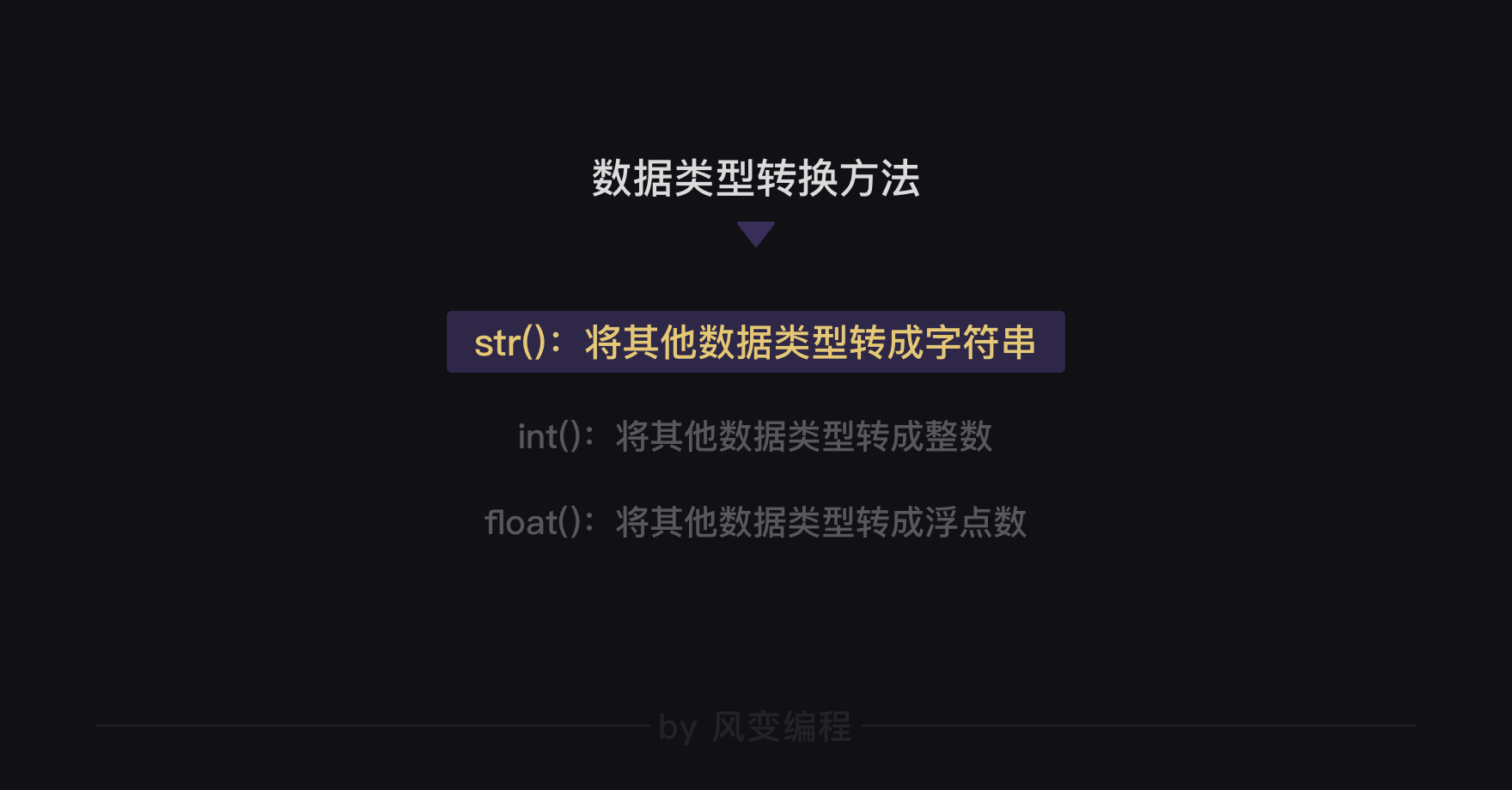 负责转换数据类型的函数一共有3种:str()、 int()和float()。