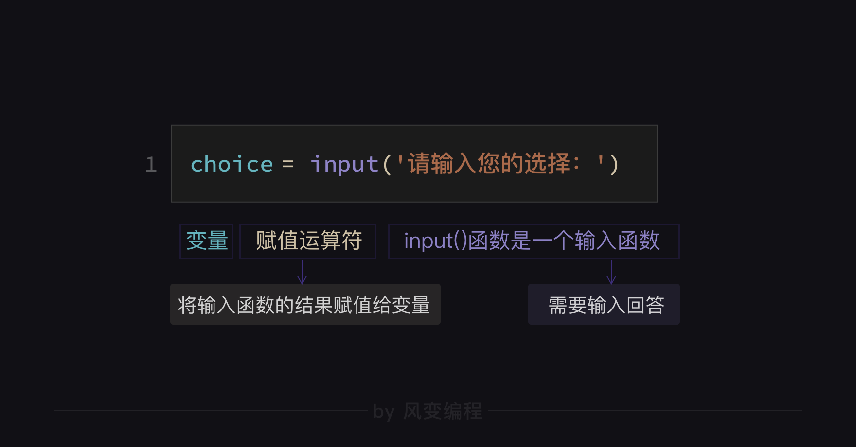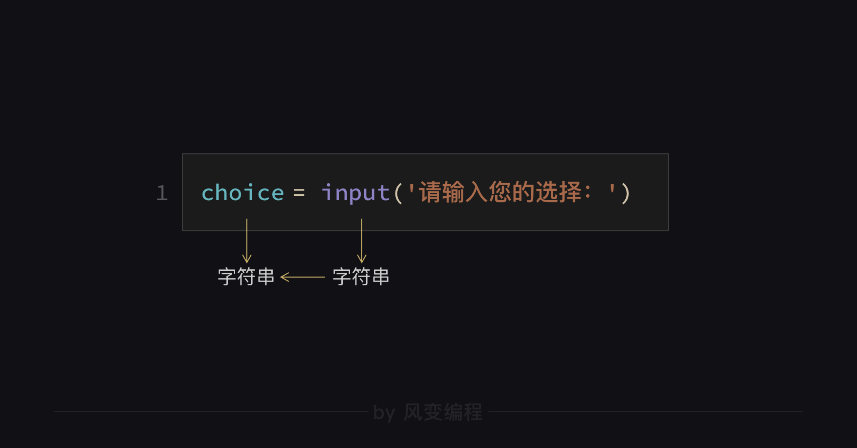 就这样,由于我们用赋值运算符【=】把input()函数的字符串结果,赋给了变量choice,所以这个变量也一定是字符串类型。