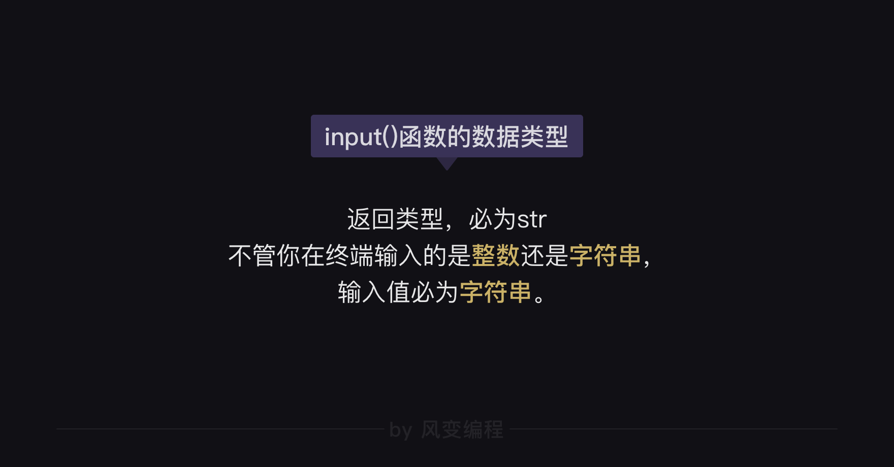 对于input()函数来说,不管我们输入的回答是什么,不管你输入的是整数1234,还是字符串『隐形斗篷是我最想拥有的魔法』,input()函数的输入值(搜集到的回答),永远会被【强制性】地转换为【字符串】类型。(Python3固定规则)