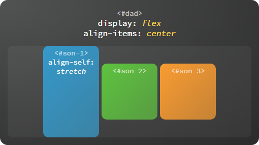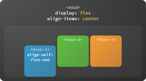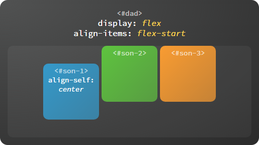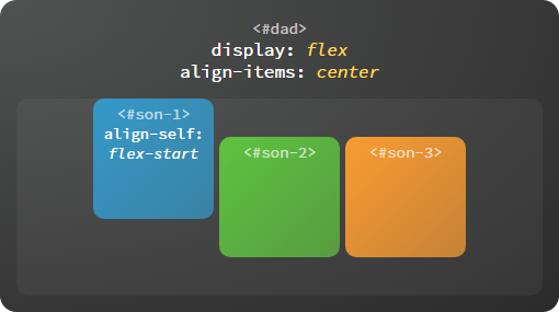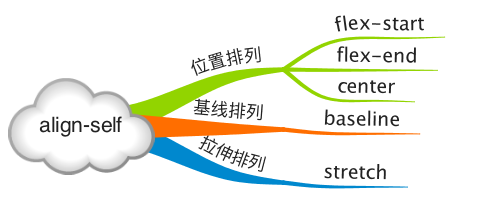 每个子容器也可以单独定义沿交叉轴排列的方式,此属性的可选值与父容器 align-items 属性完全一致,如果两者同时设置则以子容器的 align-self 属性为准。
