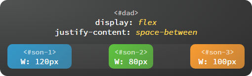 strong>space-between:子容器沿主轴均匀分布,位于首尾两端的子容器与父容器相切。