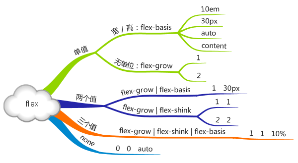 虽然 flex 是多个属性的缩写,允许 1 - 3 个值连用,但通常用 1 个值就可以满足需求,它的全部写法可参考下图。