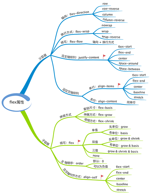以上就是 flex 布局的全部属性,一共 12 个,父容器、子容器各 6 个,可以随时通过下图进行回顾。