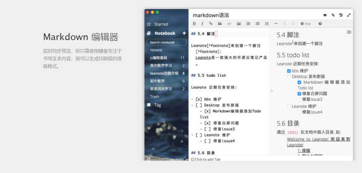 当然,如果你没有存文件的需求,只是想做做笔记,找个地方随时同步和查看,用云服务器来搭建个人云笔记也是很不错的。对于喜欢做电子笔记的同学,用markdown笔记能够提升不少效率。而刚好Leanotes就很适合: