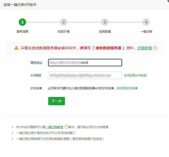 发送数据服务器上,找到我们刚刚下载的宝塔一键迁移API版本,填写面板地址和API秘钥。