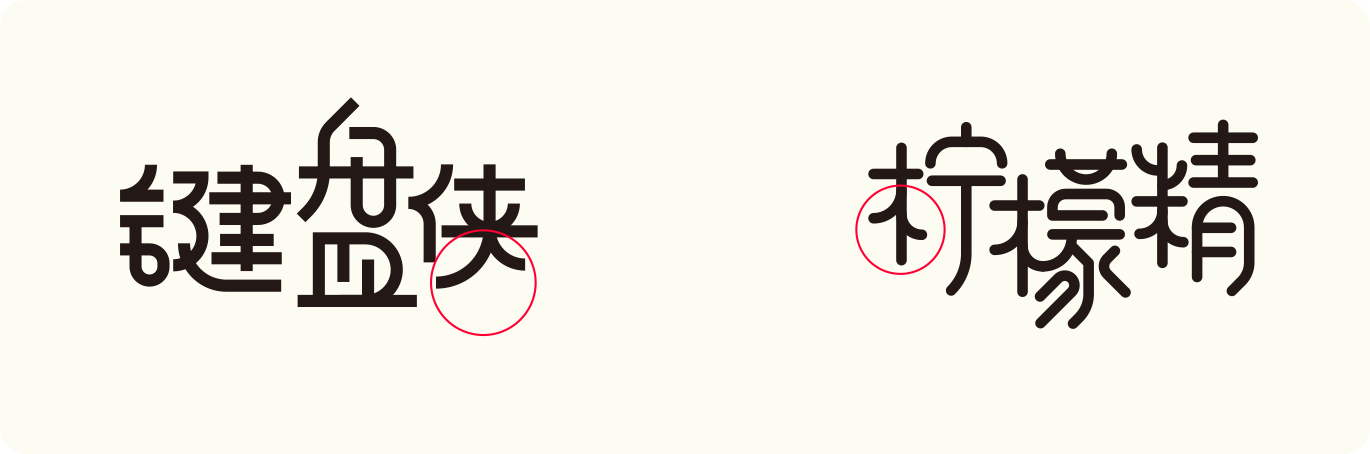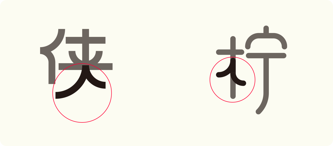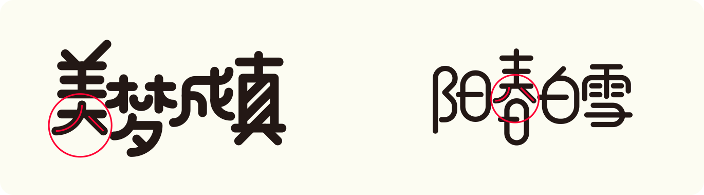 大家观察下面这两例字体,观察我红色圆圈标注的笔画部位: