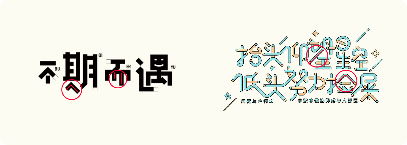 另外,像笔画的连笔设计、穿插设计、图形创意等方式,也是比较常用的,根据不同主题不同字形,适当加入和使用即可。