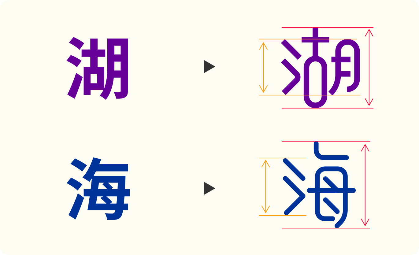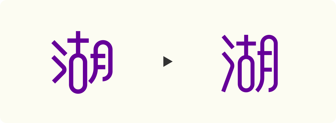 右侧的“湖”字,左中右三部分是基本等高的,这样做,并没有什么错误,只是与前面的“湖”字相对比,就少了一些个性,不够有创意,不够好玩。