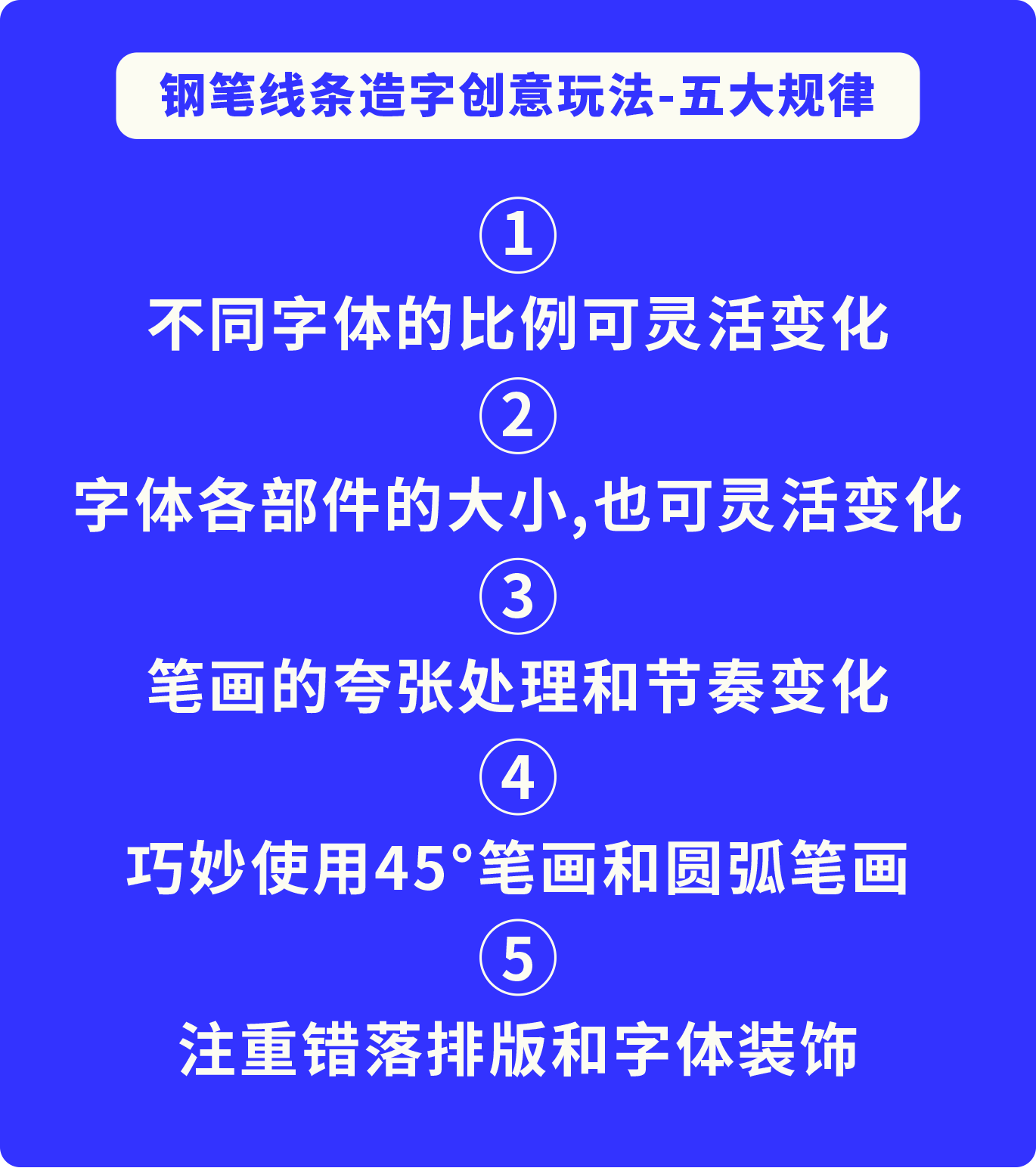 现在,关于“钢笔线条造字的创意玩法”,我已经分享了最基础最核心的五大规律。这个时候,是需要再回顾和总结一下的: