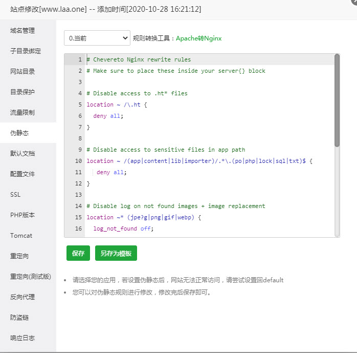 我们需要在新建的网站上设置伪静态。如果是Nginx,只要在网站伪静态那里配置下面这段: