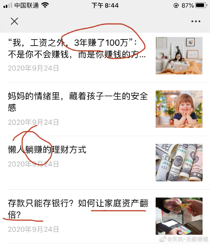 在知乎、微博、抖音、快手…这类信息流平台发布理财类内容,诸如“3年赚100万的方法”、“我的财务自由之路”,便会疯狂涨粉。