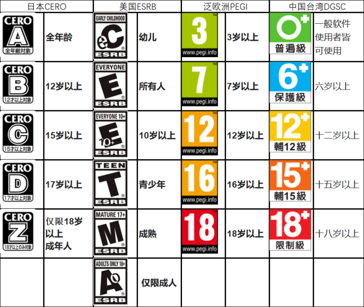 作为游戏玩家,我们最熟悉的自然是美国的ESRB、日本的CERO、欧洲的泛用标准PEGI,以及中国台湾的DGSC分级制度。