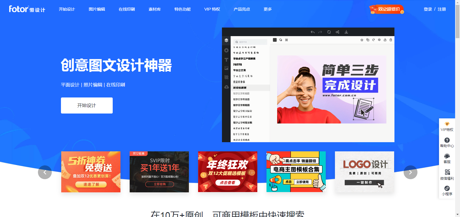 Fotor懒设计是一款设计小白也能1分钟在线完成设计在线作图软件,提供100+应用场景及尺寸,可以快速搞定海报设计、封面图、logo、PPT、贺卡等,拥有10万+的原创可商用设计模板,包括素材、字体、图片都有版权保证,拿来就用,简单、高质。