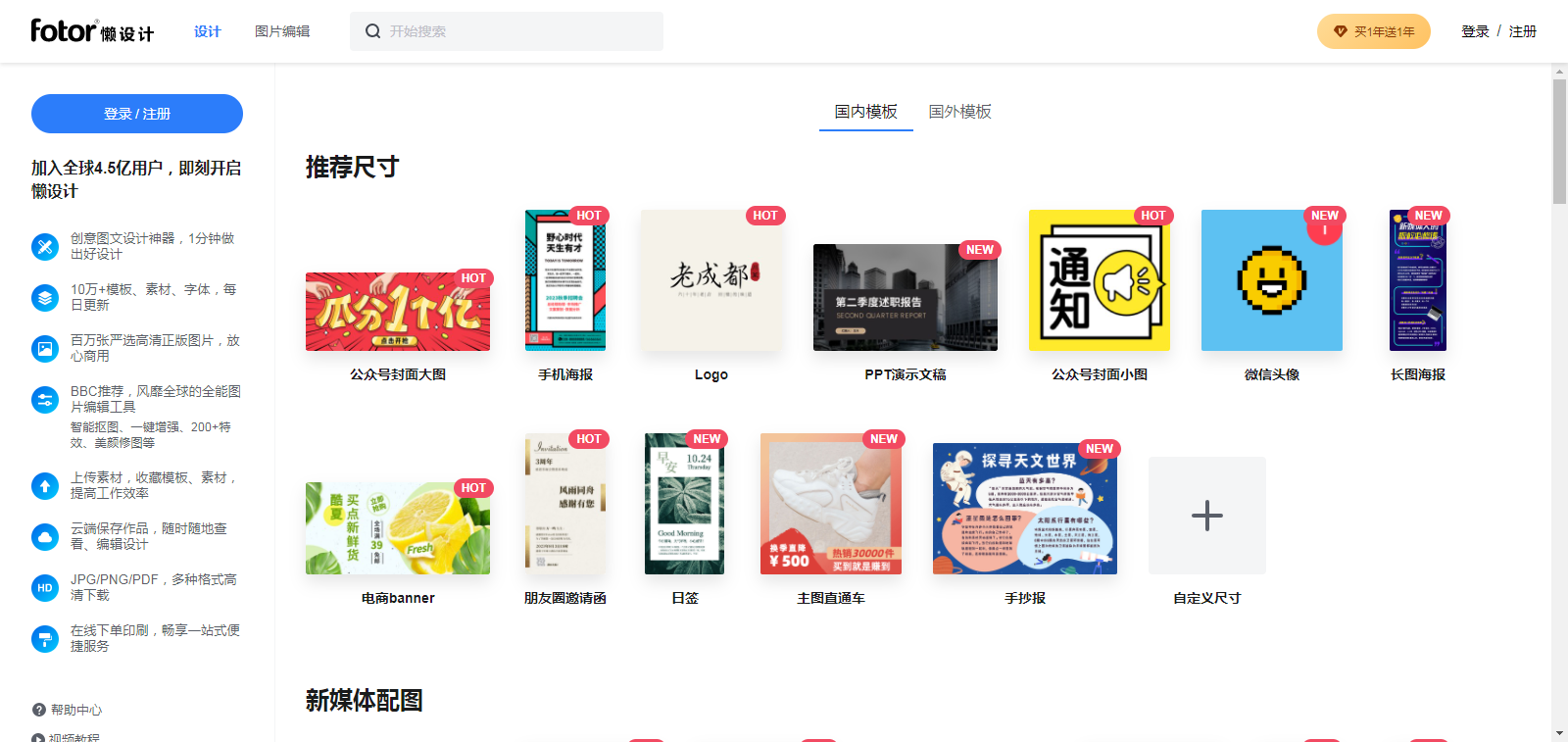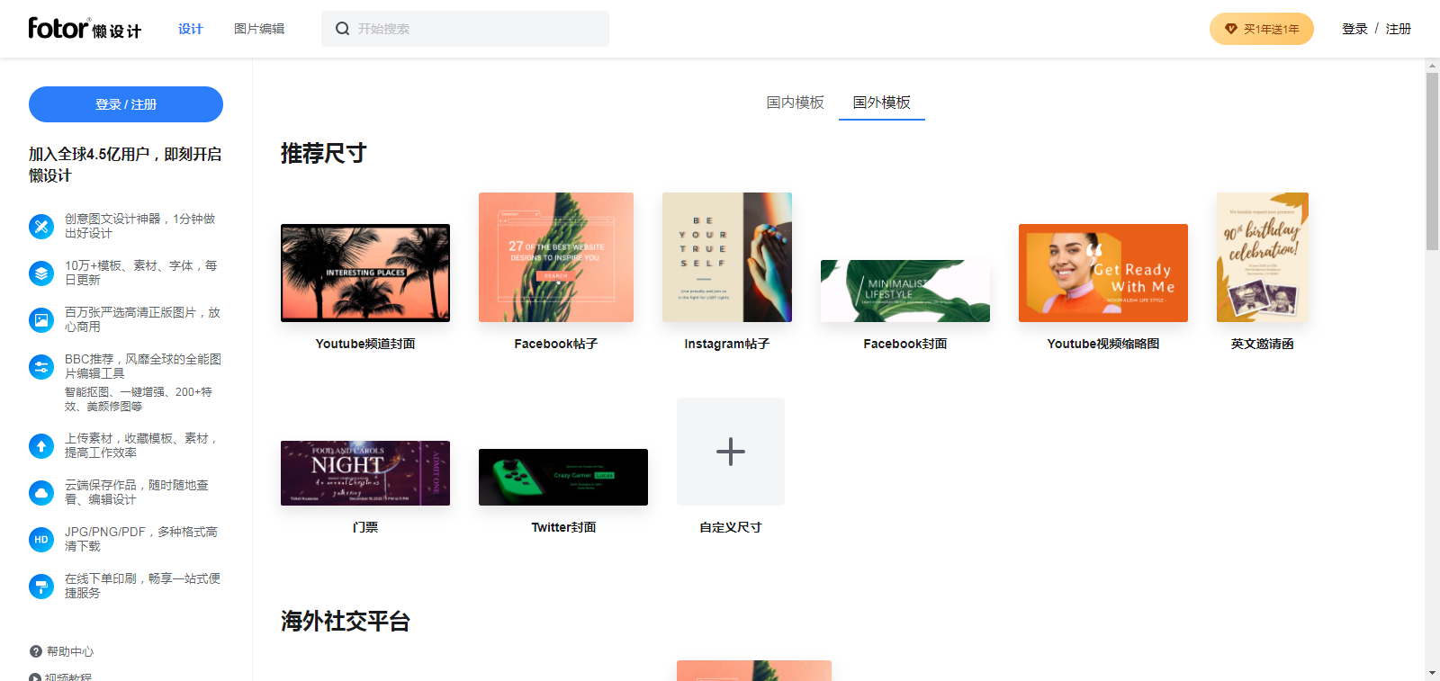 注册并登录 Fotor懒设计 之后,就能看到模板分类了,Fotor懒设计区分国内模板与国外模板,针对场景不同。