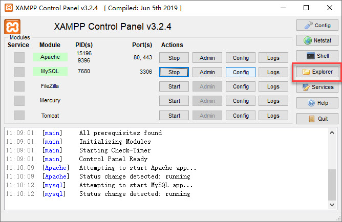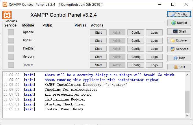 打开面板后就可以看到这个界面,默认Apache和MySQL都是未启动的