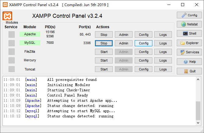 点击Apache和MySQL后面的start按钮,启动他们,变绿就代表启动成功了