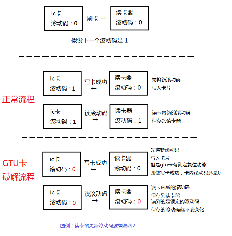 漏洞二:部分系统存在逻辑漏洞。读卡器不会立即保存最新的滚动码,需要先把新的滚动码写入ic卡,如果写卡失败,滚动码就不会更新。换而言之,只要让滚动码写卡失败,就可以让滚动码不“滚”。